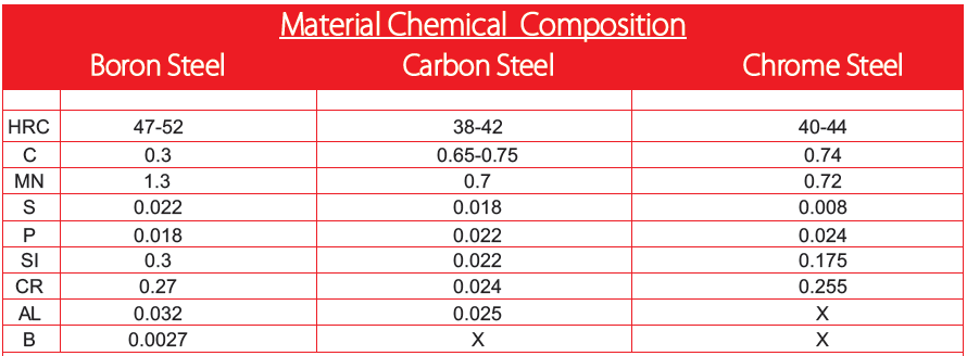 High Carbon Steel , Chrome steel and Micro Alloy Boron Steel are primarly used to manufacture agricultural disc blades. The very abrassive nature of disc in different soil conditions makes the raw material selection process a very important parameter for optimum output.